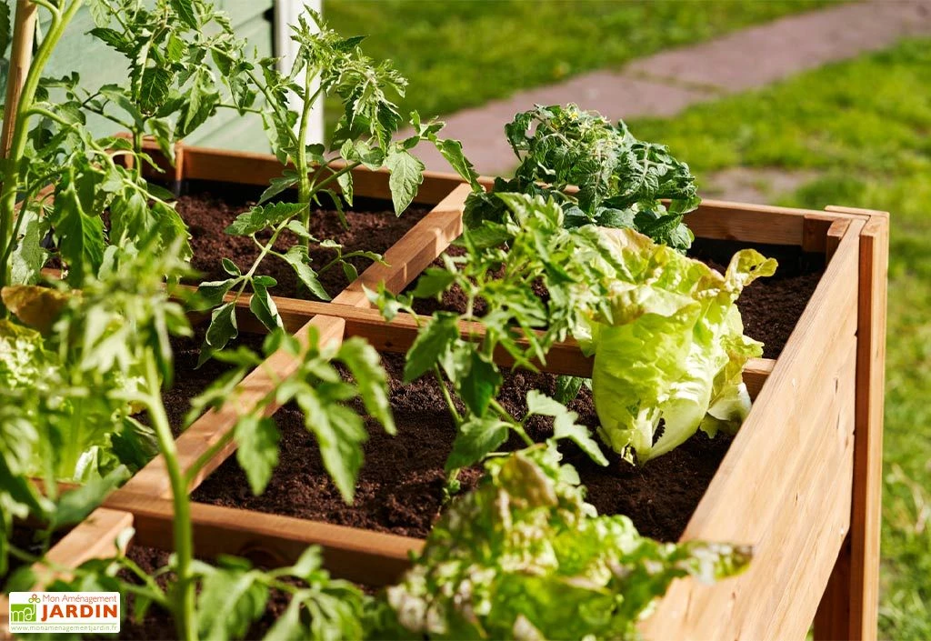 Le carré potager mesure 120 x 80 cm et dispose de 6 séparateurs pour cultiver facilement vos légumes dans des carrés de 36 cm environ. Il est surélevé grâce à des pieds en bois de 58 x 14 mm de section, pour atteindre une hauteur totale de 88 cm. Le bac potager mesure 24 cm de hauteur et le fond est à couvrir avec un géotextile pour 250 litres inclus. Une étagère sous le bac vous permet de stocker vos outils, votre terreau ou d’autres plants.