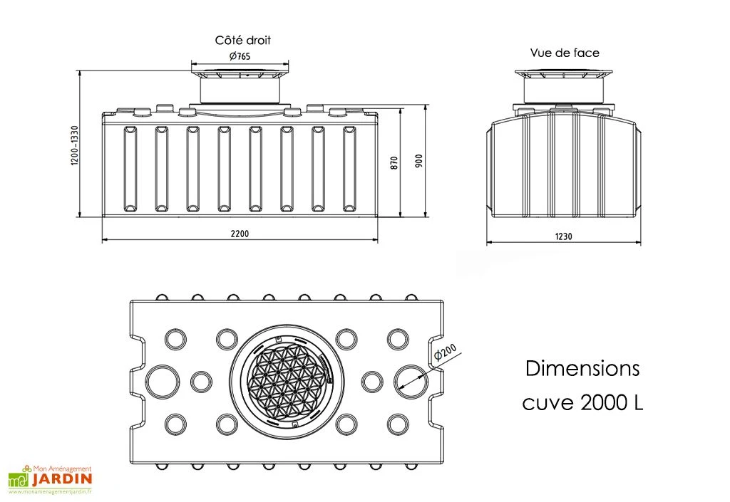 Cette cuve de récupération d’eau de pluie fabriquée en polyéthylène mesure 220 cm de longueur, 120 cm de largeur et sa hauteur est réglable entre 128 cm et 148 cm grâce à son dôme extensible. Elle pèse 90 kg. Sa contenance de 2000 litres est idéale pour un petit jardin ou un petit potager.