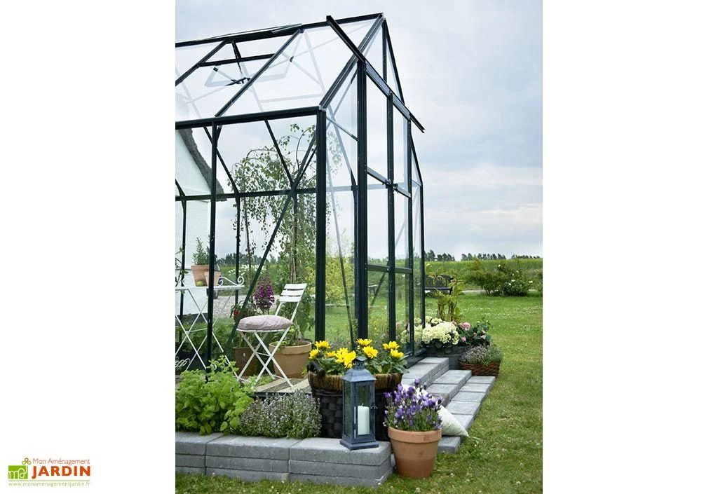Cette serre en verre s’est vue dotée d’une structure en aluminium, un métal robuste parfait pour l’extérieur qui ne craint pas la rouille, même sans entretien. Ce matériau est en outre plutôt léger, ce qui facilitera la manipulation des pièces au moment de l’assemblage de l’armature. Notez par ailleurs que la couleur noire de cette dernière lui apportera une petite touche de modernité par rapport aux serres plus traditionnelles. Les dimensions de la serre, 3,84 m de long sur 2,57 m de large, vous permettront enfin de profiter d’un espace de culture de 9,9 m².