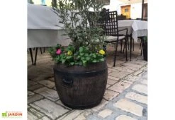 La cuve récupération d’eau de pluie 500 litres de chez Roto imite un grand tonneau en bois. Son diamètre est de 75 cm pour 160 cm de hauteur.