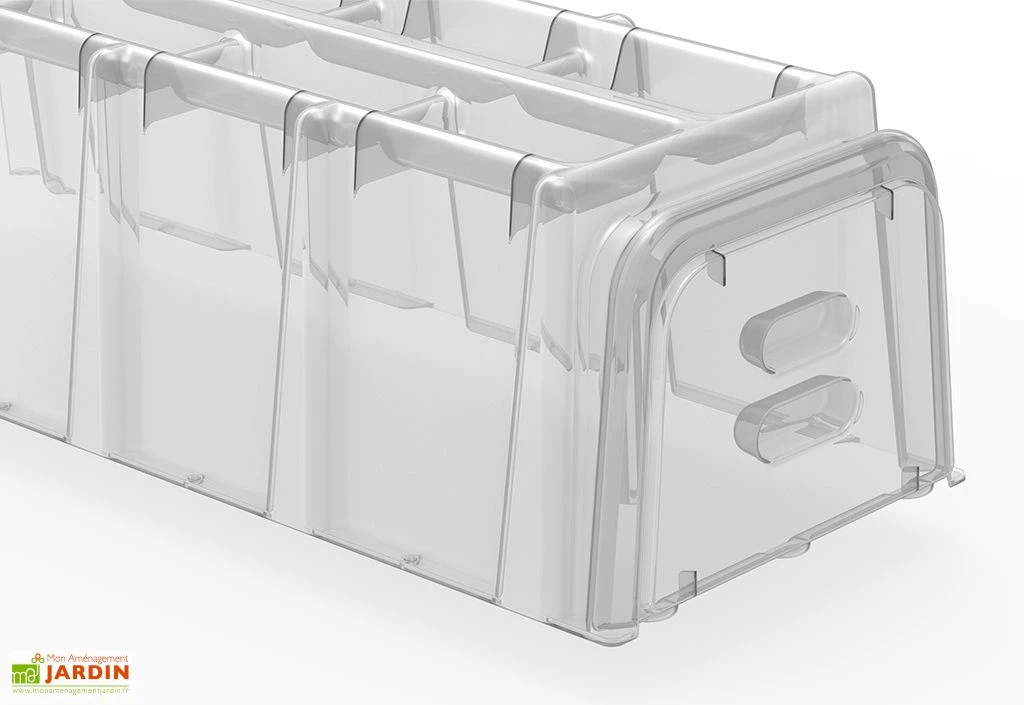 Le tunnel de forçage dispose de parois rigides de 2 mm d’épaisseur, accentuant l’effet de serre et maintenant les cultures à l’abri des gelées printanières et des animaux nuisibles. Les bacs de récupération d’eau de pluie ou d’arrosage sont intégrés et aucune manutention n’est utile durant la période forçage.