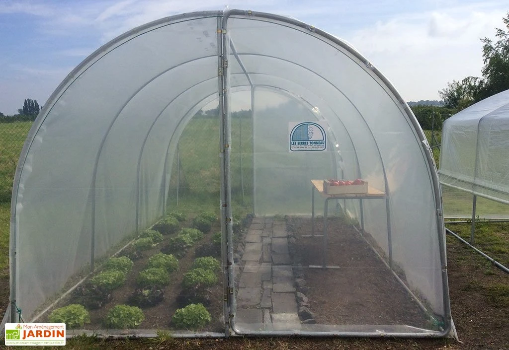 La serre est équipée de 2 portes, une à placer à chaque extrémité. Ces grandes portes pivotantes se montent dans le sens d’ouverture de votre choix. Elles offrent une bonne aération à la serre. La serre se fixe au sol par enfouissement de la bâche sur 1 m de longueur, de chaque côté. La bâche est en polyéthylène translucide de 200 microns d’épaisseur, non armée et traitée anti-UV. Elle dispose d’ourlets et de corde pour une tension parfaite et elle est marquée, ce qui vous permet de la placer facilement au centre sur l’armature.