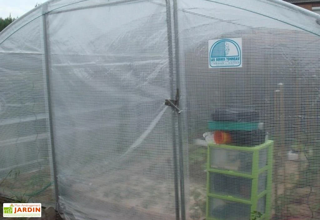Votre serre de jardin 4 Saisons Plus 4 x 9 m de chez Tonneau est équipée de deux portes pivotantes de 1,35 m de large, chacune livrée avec un filet d’aération permettant à l’air de circuler dans la serre. La bâche de toit est en polyéthylène 200 microns et les pignons en PVC armé transparent Robustex 400 microns.