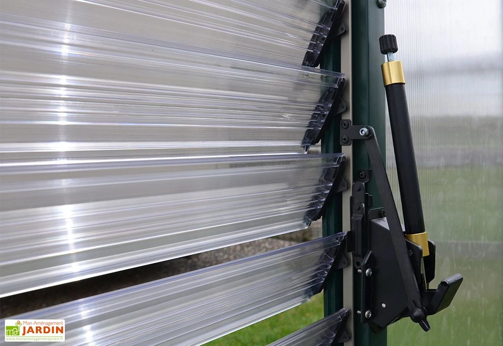 L’ouverture automatique de fenêtre s’installe sur les persiennes des serres de la marque Palram-Canopia. Elle contrôle automatiquement l’aération grâce à la cire qui se dilate sous l’effet de la chaleur. La cire pousse alors un piston qui ouvre la fenêtre graduellement et qui permet d’aérer l’intérieur de la serre. Lorsque les températures baissent la cire se contracte et un ressort vient refermer la fenêtre.