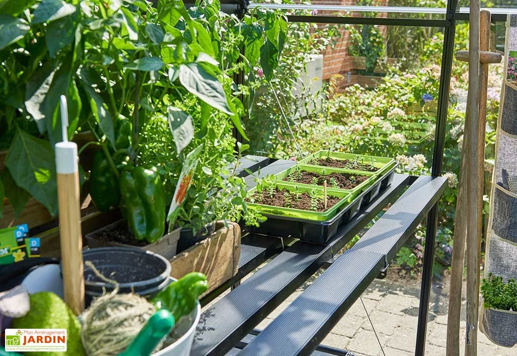 Cette table de jardinage signée Halls est à installer directement sur les parois de la serre en verre Qube 610 de la marque. Cette absence de pieds permet de libérer de l’espace au sol pour y loger une partie de vos végétaux ou pour ranger votre matériel de jardinage, par exemple.