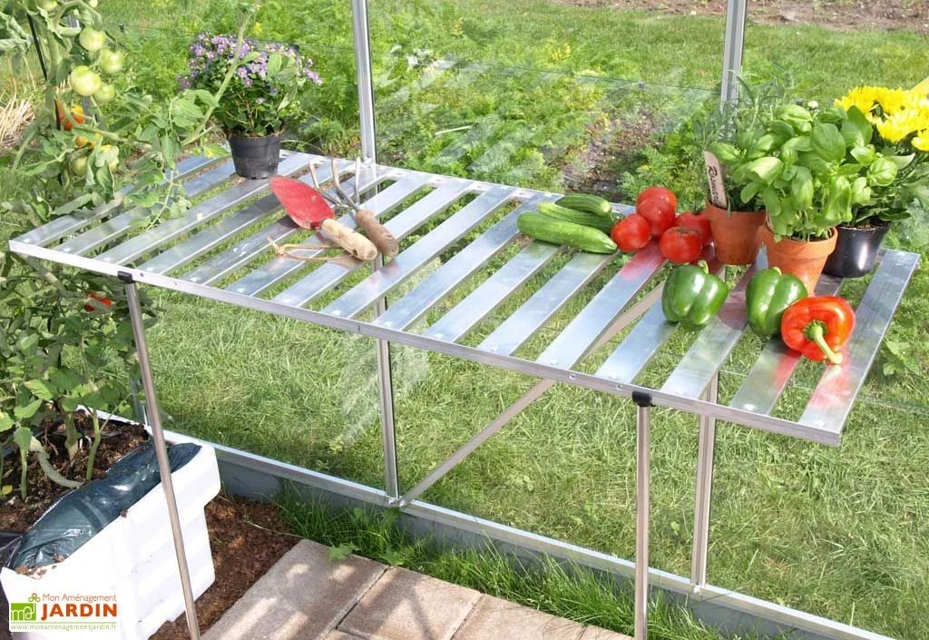 Table rabattable en aluminium anodisé. Ne peut pas être vendue sans une serre Lams.