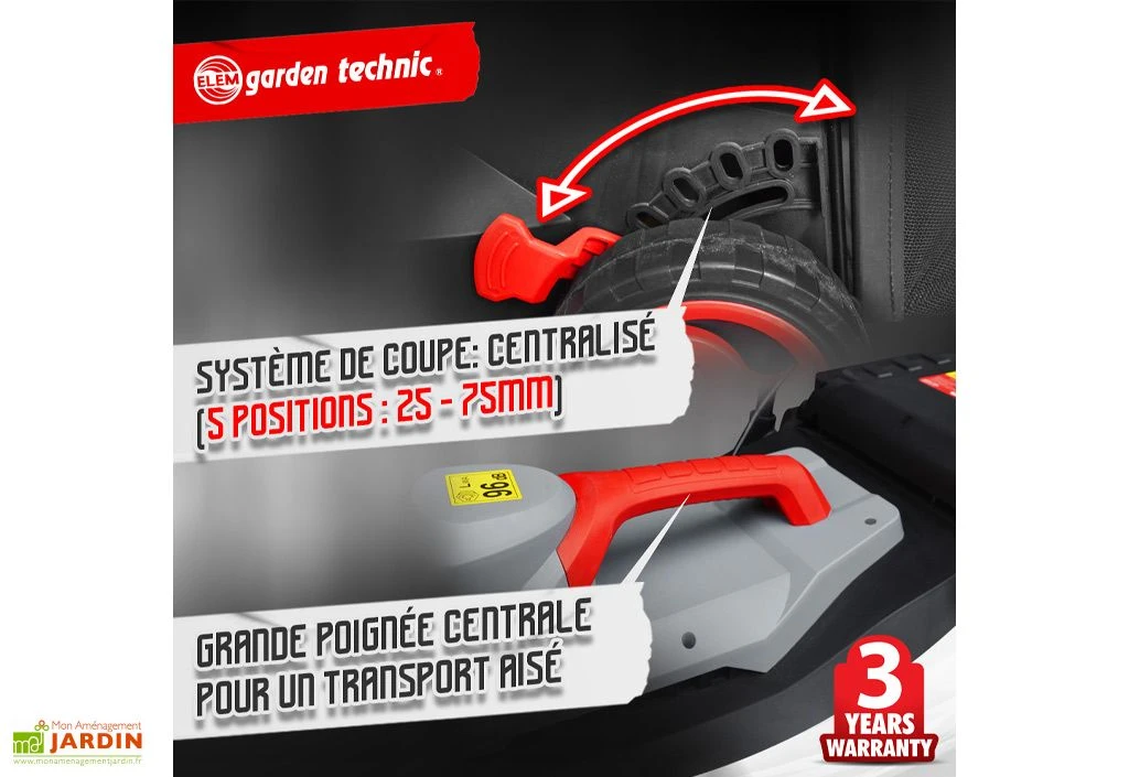 Votre tondeuse Ă gazon de chez Elem Garden est Ă©lectrique. Elle possède une puissance de 1 500 Watts. Sa largeur de travail est de 37 cm et elle possède un système de coupe Ă 5 positions qui rend son utilisation prĂ©cise et agrĂ©able. Vous pouvez rĂ©gler manuellement le système de coupe de la tondeuse Ă gazon entre 25 et 75 mm. Le carter est en PPO. La tondeuse Ă©lectrique est Ă©galement pourvue d’un bac rĂ©colteur qui vous Ă©vite de ramasser l’herbe après avoir tondu. Une grande poignĂ©e centrale vous permet de la transporter aisĂ©ment. La garantie est de 2 ans.